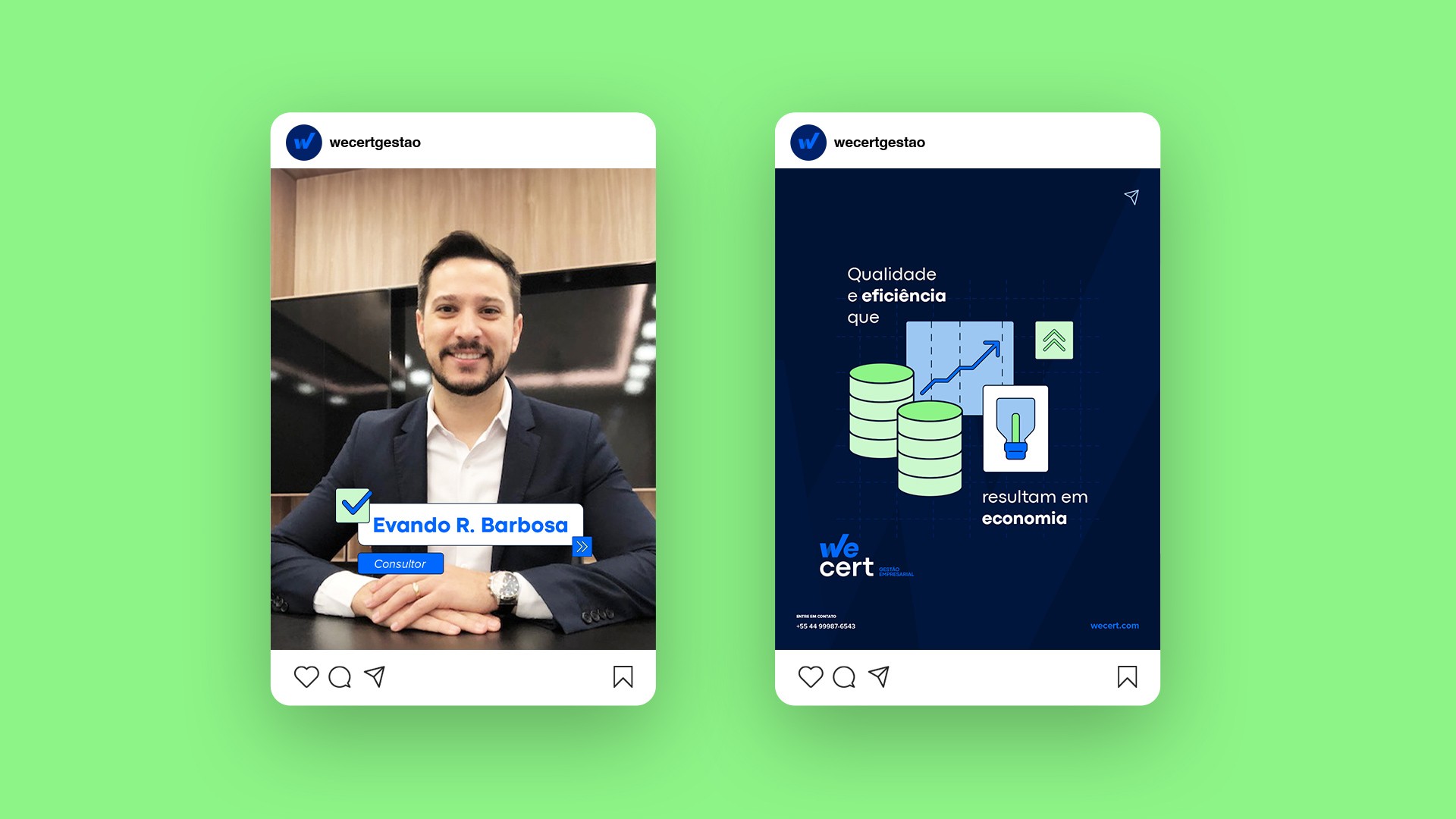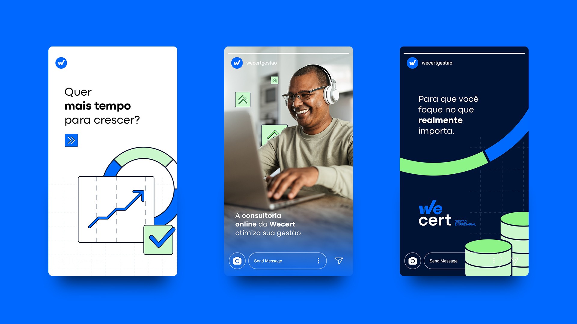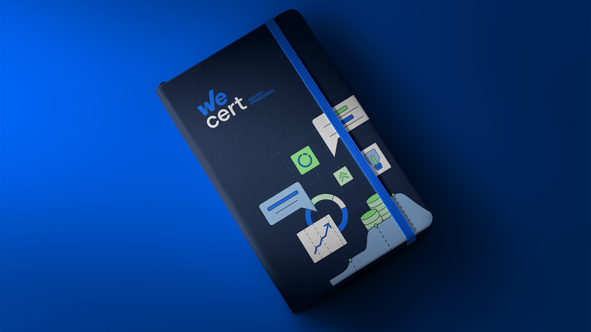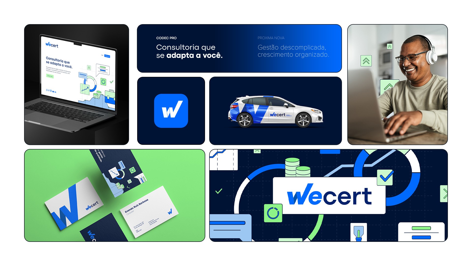 Fundada em 2014, a ERB buscava modernizar sua imagem e resolver limitações de registro de marca. O processo resultou no novo nome Wecert, unindo parceria (we) e certificação (cert). O rebranding incluiu logo tipográfica com “V check” e gráfico crescente, transmitindo objetividade, conformidade e crescimento. A paleta em tons de azul e verde reforça confiança e acessibilidade, enquanto as ilustrações autorais tornam a marca mais próxima e exclusiva. Esse trabalho consolidou a Wecert como consultoria moderna e de credibilidade no mercado.